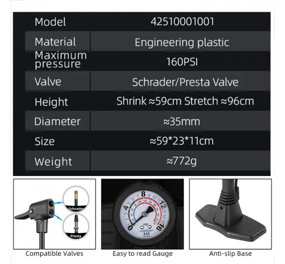 Esta practica bomba de aire cuenta con manguera extractable para proteger. Tiene función de gran volumen para una fácil inflación. Alcanza una presión de 80psi la inflación. Construida en Aluminio de alta resistencia. Cabezal Reversible para escurridor y Presta.