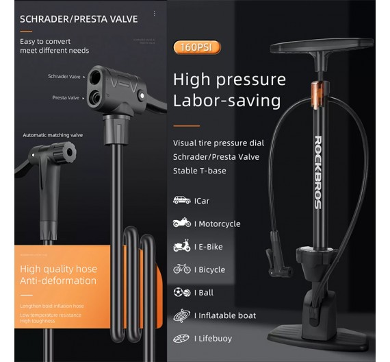 Inflador para bicicletas Rockbros Air-9 de piso. Incluye barómetro que permite una correcta visualización de la presión.