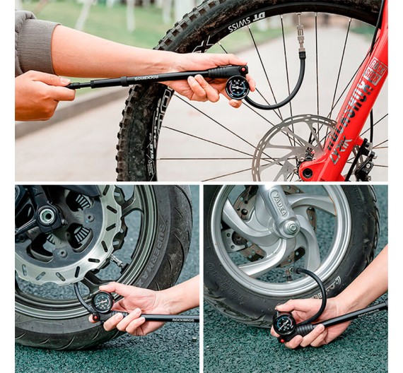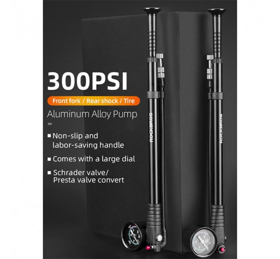 Mini bomba liviana Rockbros con capacidad de presión de 300 psi. Le permite inflar llantas MTB o de ruta, incluso balones sin dificultad