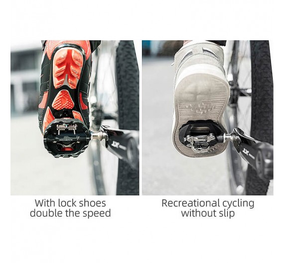 Pedales de bloqueo Doble propósito Rockbros para zapatos de ciclismo. Elaborados en aleación de aluminio y acero de molibdeno cromado. Para uso en calzado de ciclismo o tenis normales.